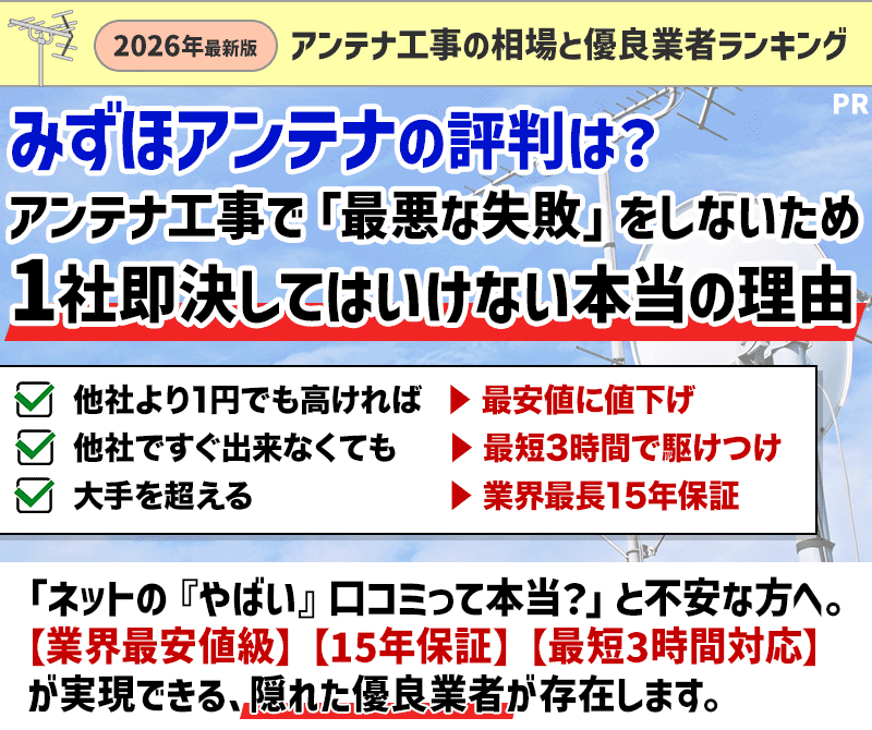 みずほアンテナを基準にすることで、1位の業者が提供している「他社より高い場合は値下げ(5,000円割引)」という強烈なメリットを確実かつ最大限に引き出すことができます。