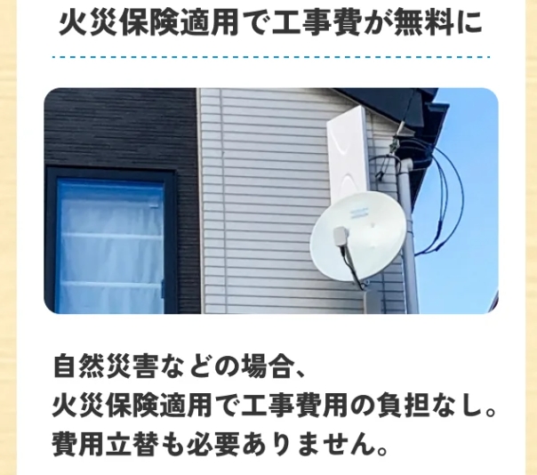 台風や強風など自然災害による故障の場合は、火災保険の申請サポートもしてもらえるため、実質負担0円でアンテナ交換ができるケースもあります。