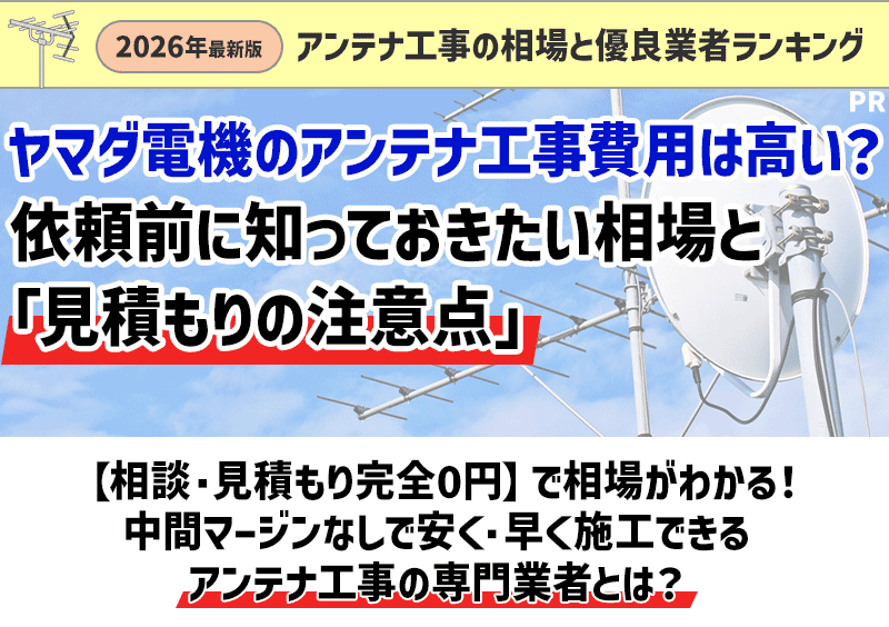 ヤマダ電機に依頼する前に、「見積もり・出張費が完全無料」のアンテナ専門業者に相談し、お住まいの地域の正確な工事費(底値)を出してもらうことです。
