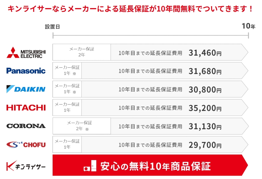 製品保証 10年無料保証 有償で10年保証あり メーカーごとに異なる