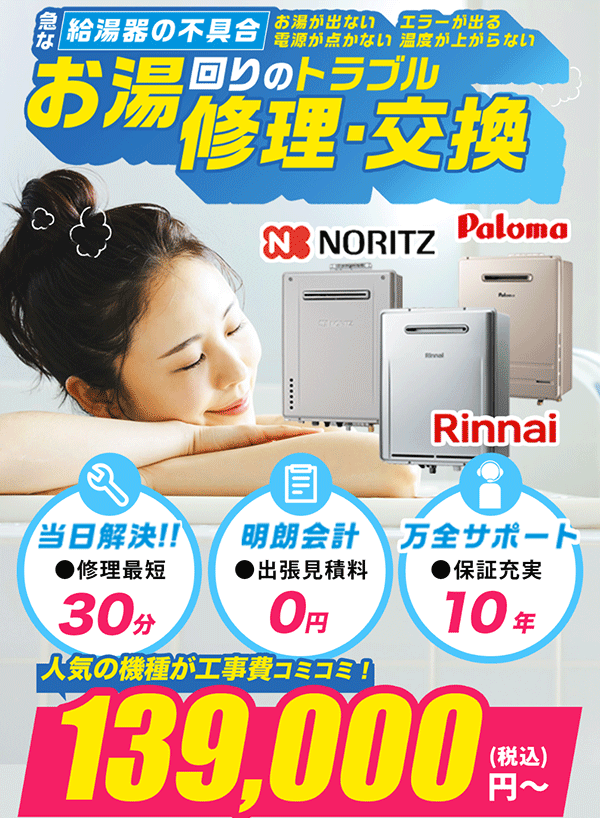 | 取扱メーカー | ガス給湯器(ノーリツ・パロマ・リンナイ他) エコキュート(コロナ・ダイキン他) |